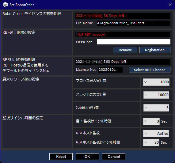 ■ RBF利用の有効期限 / RBF Hostの通信で使用するデフォルトのライセンスNo. RBF Hostの仕様より、同じRBFライセンスファイル(ライセンスNo.)がRBF Host(PC)間で登録されていないと通信する事ができません。 この為、RBF Host間の通信で使用するデフォルトのRBFライセンスファイルをここで登録します。 RobotCtrler と RBF Host の通信で使用する為、デフォルトの有効なRBFライセンスファイルを必ず登録する必要があります。 複数異なるRBFライセンスファイルを保有されている場合で、RBF Host間の通信をここで設定するデフォルトのRBFライセンスファイル以外で通信を行う場合は、 「Set RBF Host Robo No.」画面でRBF Host間の通信で使用するRBFライセンスファイルを個別に設定することができます。 登録したRBFライセンスファイルの有効期限が残り30日以下なりますと赤色文字で表示されます。 【本ソフトウェアをインストール後に初めて画面を表示した場合】 本ソフトウェアをインストールされたPCにRBFが既にインストールされてあり有効なRBFライセンスファイルが既に RBF側のLicフォルダーに設置されてある場合は、本ソフトウェアがインストールされた時にそのRBF側のLicフォルダーを参照しに行き、有効なRBFライセンスファイルが登録され、それが表示されます。 複数異なるRBFライセンスファイルが設置されてある場合は、一番有効期限が長いRBFライセンスファイルが登録され表示されます。 ■ Select RBF License ボタン 現在 AI Agent Robot Controller に登録されているデフォルトのRBFライセンスファイル以外のRBFライセンスファイルを登録したい場合は、 [Select RBF License] ボタンをクリックして他のRBFライセンスファイルに変更することができます。 [Select RBF License] ボタンをクリックしますと Select RBF License 画面が表示されます。 リストビューに表示されているRBFライセンスファイル情報は、下記の順に検索されて見つかったRBFライセンスファイルの情報が一覧で表示されます。 (1) RBFのLicフォルダーに設置されたRBFライセンスファイル (ファイル拡張子 .lic) (2) RobotCtrler のLicフォルダーに設置されたRBFライセンスファイル (ファイル拡張子 .lic) 変更したいRBFライセンスファイルを選択して OK ボタンをクリックして下さい。 この画面でOKボタンをクリックしてもまだ登録されません。元のSet RobotCtrler 画面のOKボタンをクリックした時点で登録されます。 AI Agent Robot Controller(略:RobotCtrler) がインストールされたPCにRBFをインストール(セットアップ)していない場合で、RobotCtrlerとRBF Hostとで通信を行いたい場合は、 RobotCtrler側のLicフォルダー配下に有効なRBFライセンスファイルを設置して下さい。 ■ 最大リソース値の設定 最大リソース値は、RobotCtrlerが実行されているPCの負荷状況をリアルタイムで表示させる設定(チューニング)を行います。 AIAgentCtrl(PC)でプログラムを実行する場合に当然PCの処理能力や負荷に依存してプログラムの処理が遅くなります。 AIAgentCtrl(PC)のプログラムの実行負荷に影響する情報をリアルタイムで表示して目視できることで未然に対策を行えるようにするものです。 ここで設定する最大リソース値は、Windows PCの通常の使用時の使用率(Usage)が50%以下になるように設定します。 要は、Home 画面に表示されるグラフ表示が 50%を超えている場合は「負荷が高い」と目視できるようにチューニングします。 [プロセス最大実行数] PCの処理能力に依存したWindowsの全体のプロセス実行数の最大値の目安を指定します。 既定値 : 1000 <参考> PCのメモリ容量、CPUスペックに関係無しにWindows全体のプロセス数が 1,024プロセスを超えるとWindowsの挙動がおかしくなる場合があります。 仕事でWindowsの一般的な使用で 200~300 実行プロセス数である場合が多いです。 初代Windowsからのレガシー仕様によるものなのかは定かではありませんが、長くWindowsを使用しているとWindowsフォルダーが肥大化する仕様が変わらないのと同じ、実行プロセス数目安1000を超えるとフリーズする現象(または挙動不審)になる場合が発生する場合があります。またバックグラウンドで自動で Update等が実行されている場合など、MaterRoboで新しくプロセス(プログラム)を起動する特性から負荷を目視できることは重要だと考えております。 尚、本格的にPCのリソースを監視したい場合、専門の監視ソフトウェアをご利用ください。 [スレッド最大実行数] PCの処理能力に依存したWindowsの全体のスレッド実行数の最大値の目安を指定します。 既定値 : 10,000 <参考> スレッド数が多いと言うのは、負荷が高くなる、メモリが逼迫する可能性があります。 [Job最大実行数] PCの処理能力に依存したJobコマンド実行数の最大値の目安を指定します。 既定値 : 5 <補足> 既定値は、最低値の5としてあります。RobotCtrler の運用に依存して増加ください。 RobotCtrler で同時に実行できるJobコマンド数は、予約メモリサイズとして512個まで確保しておりますが、実質約100個が限界と考えております。 ■ 監視サイクル時間の設定 [
